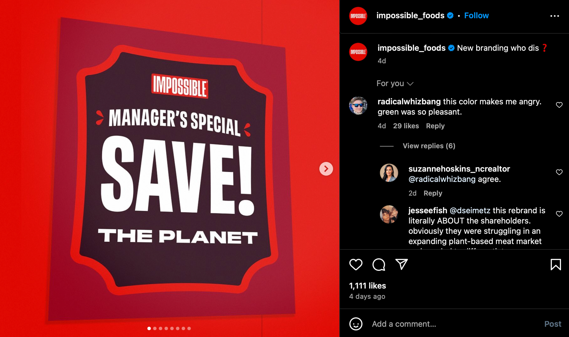 The rebrand to red meaty meatness is highly crafted and resolves some long standing brand contradictions, but the big question is whether going all in on a meat parity strategy will drive consumers to pick up Impossible.