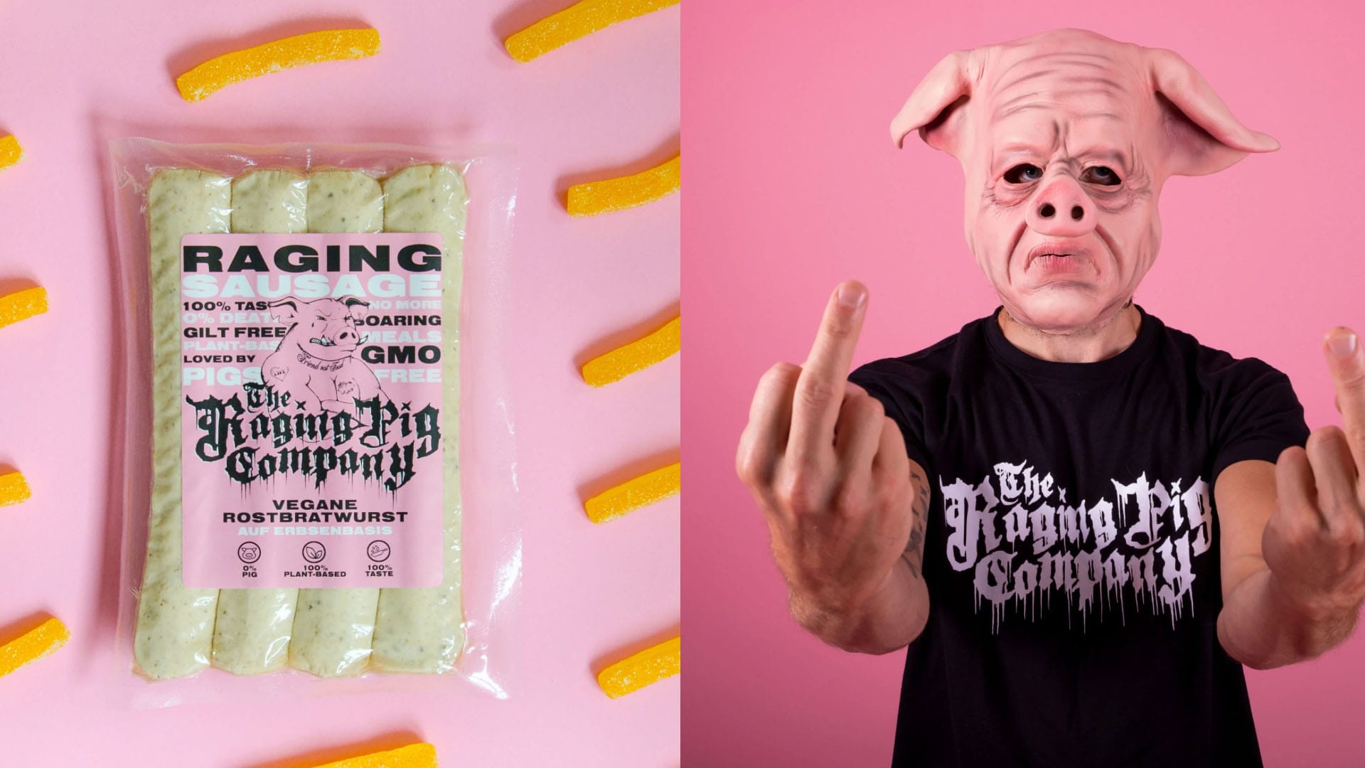 A sausage from peas and mushrooms, made to taste like pork. No novel ingredients here and plenty to build reassuringly familiar from. Instead they’ve taken the path of confronting consumers with an angry pig and apocalyptic death metal typography, complete with imagery of people wearing pig heads. Very little to cue everything people love about pork sausages and are tuned into when shopping for their weekend bbq.