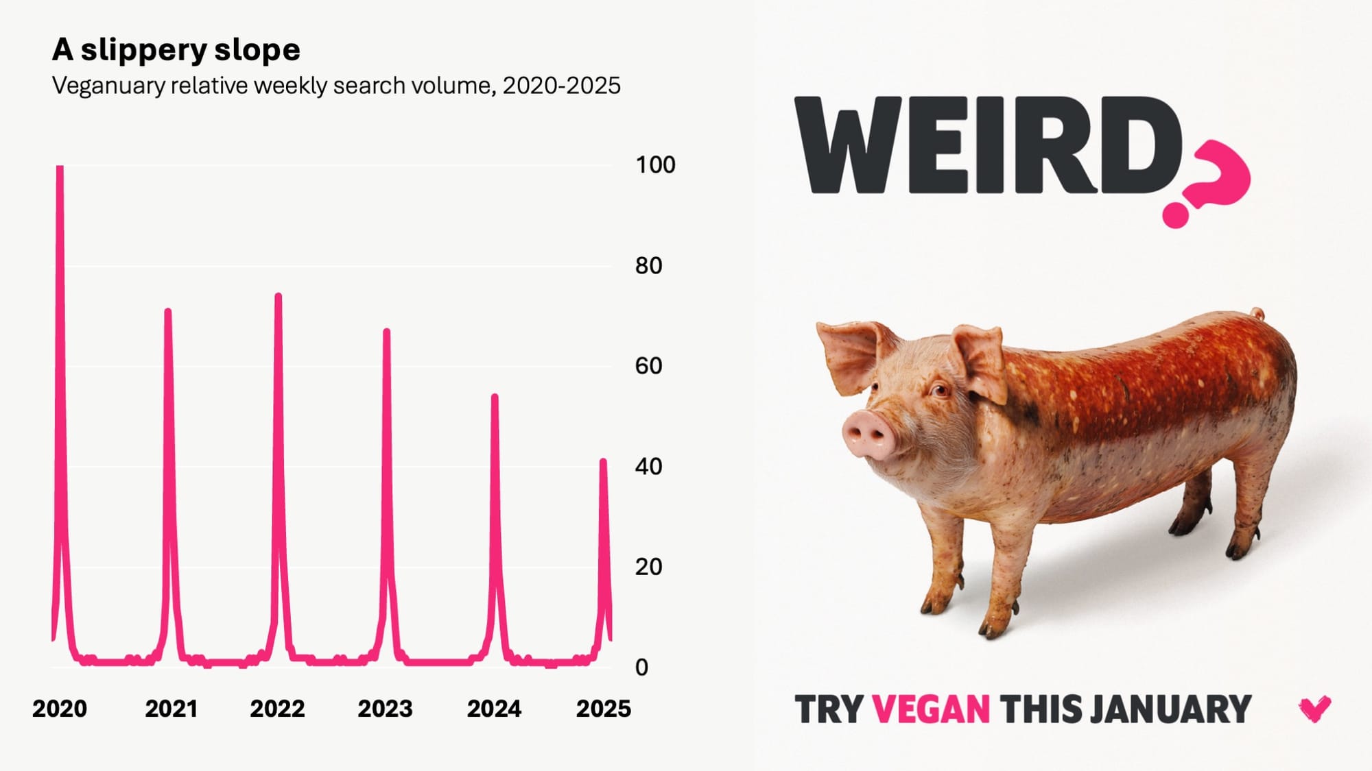 The longest running multi-national barometer of the consumer appeal of veganism is arguably the Veganuary campaign. Using a basic measure of popularity such as Google search volume the picture continues to be sobering. Significant drops in interest have continued year on year, with the latest January 2025 data down by 60% from the 2020 peak. If you look at the latest Veganuary campaign it’s not difficult to see why.